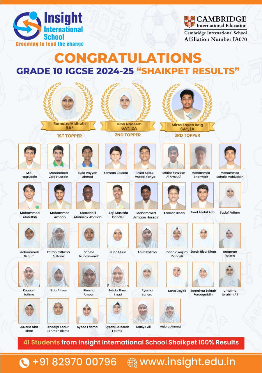 Insight International School was established in the year 2012 in the Cosmopolitan city of Hyderabad in Telangana state of India which provides Global standard education with values. Insight is affiliated with Cambridge assessment International education and follows IGCSE curriculum. Read More....